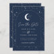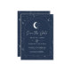 A celestial moon and star themed save the date card with a dark navy background and white text with elements. Customise the colour of the star pattern, background, arch fill and moon element!
