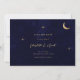 A minimalist modern celestial wedding invitation features a simple and elegant design. It includes a gold foil moon and stars that gently sparkle, set against a midnight blue background. The invitation uses classic serif typography, which adds a traditional and formal touch with its neat and clear style.