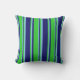 This throw pillow design features a midnight blue, lime green, and sky blue colored striped pattern.