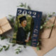 Elegant rose gold graduation invitation in dark blue personalized with one photo on the cover and three more photo on the back. Double sided graduation invitation printed with rose gold foil against a midnight blue background with the graduate's photo in an arch shape and a pretty rose gold arrow. Graduation invitation personalized with photos and the graduate's name in rose gold foil.