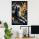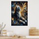 A vibrant painting capturing the essence of a cat against a striking black background, showcasing its graceful demeanor and intense gaze.