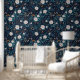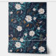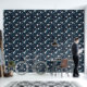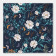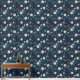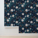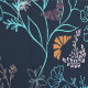 A serene floral pattern set against a deep navy background, "Midnight Garden" features delicate white blooms intertwined with finely detailed foliage in soft turquoise, orange, and muted purple hues. The intricate linework of the flowers and leaves creates a sense of depth and elegance, while the subtle inclusion of butterflies adds a touch of whimsy. The contrasting colors stand out beautifully, evoking the tranquility and mystery of a garden at night.