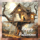 Perched atop a gnarled old tree, a rustic treehouse glows with warm lantern light, casting flickers across the autumn leaves below. A ghostly figure lounges peacefully on the porch beside a watchful black cat, both bathed in moonlight as bats swirl overhead. Bare branches stretch into the night sky, silhouetted against the full moon’s silver gaze. Whimsical and eerie, the scene hums with quiet magic—where spectral visitors and feline companions share secrets under the stars.