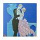 Midnight Kiss Art Deco tile. Art Deco illustration from 1921. French artist Georges Barbier was famous for his beautiful and lively depiction of Parisian nightlife. Midnight Kiss depicts a couple standing on a balcony overlooking the river as a boat sails by in the distance. The man wears a black tuxedo and leans in for a kiss while the woman wears a frilly pink dress, pink bow and pink hair sash. Two blue doves fly above them into the night sky. A romantic gift for fans of Georges Barbier, Art Deco, and Vintage Paris.