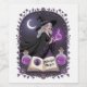 An enchanting digital illustration featuring a young witch with silver hair and a floral-trimmed hat. She is shown brewing magic, holding a glowing purple potion bottle while an open spellbook titled "Midnight Magick" sits before her. The scene is set within a decorative purple floral frame under a crescent moon, creating a whimsical and mystical atmosphere. With its clean linework and vibrant purple and black color palette, this artwork is perfect for fantasy lovers.