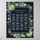 This wedding seating chart features painted watercolor succulent, eucalyptus, and botanical green leaves with a rectangle frame on a midnight navy blue background. Matching items are also available.