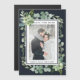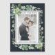 This wedding save the date photo magnetic card features painted watercolor succulent, eucalyptus, and botanical green leaves with a rectangle frame on a midnight navy blue background. Matching items are also available.