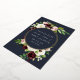An elegant wedding save the date design featuring your wedding details centered in a gold foil-framed circle, with a border of lush watercolor flowers and foliage in blush, ivory, burgundy, and green on a rich midnight blue background.