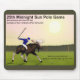 A polo player riding a moose (Alces alces), mallet raised to strike. The sun hangs low over the surrounding conifer forest. Text reading, "25 Midnight Sun Polo Game", "Sponsored by the North Star Polo Club", "Sunday at the Fairbanks Polo Grounds" and "Begins promptly at midnight Mosquitos and kinds under eight get in free" also appears.