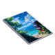 Step into a vibrant, sun-drenched scene that blends Japanese tradition with breathtaking natural beauty. This artwork, rendered in a crisp, anime-inspired style, features a majestic vermilion pagoda overlooking a perfect azure ocean. Lush greenery frames the view, inviting you down to the sparkling white beach where the clear, turquoise water meets the sand. It’s a perfect piece for anyone seeking to bring the tranquil yet vivid energy of a perfect Japanese summer day into their home or wardrobe.