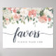 Designed to match our Midsummer wedding collection, this elegant floral sign invites guests to take a favor. Personalize with two lines of custom text in calligraphy and block lettering (shown with "Favors; please enjoy"), with a top border of pastel watercolor flowers and foliage in blush pink, peach and sage green.