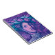 Spiral notebook featuring colorful artwork, beautiful mysterious girl in hat, decorated by blooming rose flowers and running hares. Magic realism / surreal pop surrealism / new contemporary. Pastel painting in purple and violet shades, soft pastels on paper, 2020