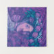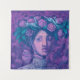 Tapestry featuring colorful artwork, beautiful mysterious girl in hat, decorated by blooming rose flowers and running hares. Magic realism / surreal pop surrealism / new contemporary. Pastel painting in purple and violet shades, soft pastels on paper, 2020
