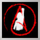 A poster of a white sketchy man or woman with his or her fist in the air with a red crimson scarlet letter A for atheism on a black background.