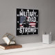 This powerful graphic features a resolute soldier holding a rifle, silhouetted against a distressed American flag. Bold, white, rugged text proclaims "MILITARY DAD STRONG," emphasizing strength and dedication. The overall design is a patriotic tribute, celebrating the unwavering service and heroic spirit of military fathers.