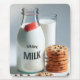 A classic glass milk bottle with "DRINK MILK" printed on it sits next to a full glass of milk and a stack of chocolate chip cookies with a few scattered chocolate chips