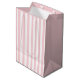Medium gift bag with millennial pink and white stripes on the front and back. Both sides are solid millennial pink. Modern and trendy, it is the perfect classic gift bag for gift giving.