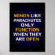 Motivational poster. Minds like parachutes only function when they are open. Open space, starry sky style. Print design. Dark background
