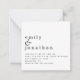 A charming miniature size 2.5" square. PLEASE NOTE if you are in the US, the 2.5” square is smaller than the minimum US postage requirement so please choose size 5.25” x 5.25” square if you are intending to mail them (Note too that square cards may cost more to mail than rectangular ones). Your names are large in stylish lowercase with the details beneath and lots of white space on a square shape for a contemporary style. Easily personalise the text to your own details.