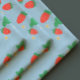 A fabric design that features a delightful and playful pattern of scattered mini strawberries on a soft, sky blue background. The strawberries are rendered in a vibrant red with green leaves, and they are interspersed with small, delicate white or light yellow flowers, adding to the charm. The overall impression is cheerful, fresh, and sweet, making it ideal for various children's items such as clothing, bedding, or nursery decor.