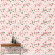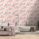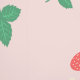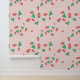 A sweet cute wallpaper that features a delightful and playful pattern of scattered mini strawberries on a sweet, light pink background. The strawberries are rendered in a vibrant red with green leaves, and they are interspersed with small, delicate white or light yellow strawberry flowers, adding to the charm. The overall impression is cheerful, fresh, and sweet, making it ideal for nursery’s decor and baby, toddler, child rooms.