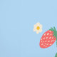 A sweet cute wallpaper that features a delightful and playful pattern of scattered mini strawberries on a soft, sky blue background. The strawberries are rendered in a vibrant red with green leaves, and they are interspersed with small, delicate white or light yellow strawberry flowers, adding to the charm. The overall impression is cheerful, fresh, and sweet, making it ideal for nursery’s decor and baby, toddler, child rooms.