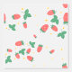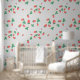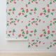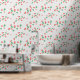 A sweet cute wallpaper that features a delightful and playful pattern of scattered mini strawberries on a sweet, light grey background. The strawberries are rendered in a vibrant red with green leaves, and they are interspersed with small, delicate white or light yellow strawberry flowers, adding to the charm. The overall impression is cheerful, fresh, and sweet, making it ideal for nursery’s decor and baby, toddler, child rooms.