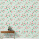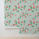 A sweet cute wallpaper that features a delightful and playful pattern of scattered mini strawberries on a sweet, light muted green background. The strawberries are rendered in a vibrant red with green leaves, and they are interspersed with small, delicate white or light yellow strawberry flowers, adding to the charm. The overall impression is cheerful, fresh, and sweet, making it ideal for nursery’s decor and baby, toddler, child rooms.