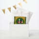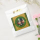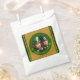 Miniature Leprechaun in 3D + "Happy St Patrick's Day" into a green circle + golden textured paper (image printed) as background. Design on favor bag.