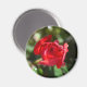 Miniature Red Rose magnet. A pretty miniature red rose blossom about to open covered in fresh spring raindrops tumbling down its soft petals. A beautiful gift for fans of rose photography, floral art, and flower design.