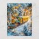 A festive miniature steam train with glowing lights runs through a snowy mountain landscape lined with fir trees, inspired by the Bavarian Alps at Christmas.