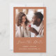This simple, minimalist Save the Date card features a square photo above the words "Save the Date" in elegant white handwriting script, followed by the couple's names, wedding date and city in sans serif font on a terracotta background. Add a second, horizontal photo and a more detailed message with additional information on the reverse.