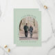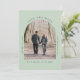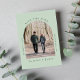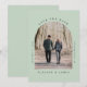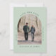 Minimal sage green save the date announcement card featuring your photo in an arched picture frame and simple modern typography.