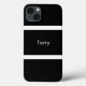 Minimal, modern and stylish cell phone case with a black and white stripe pattern. Large black stripes and small white stripes. Personalized with your name printed in a white text.