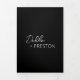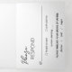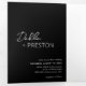 Modern black trifold wedding invitation featuring a simple and minimal design with the bride's name in an elegant script and the groom's name in a contemporary sans serif font. Below in the lower right corner are your event details in a minimalist layout. The middle panel has your favorite photo, the right panel is your RSVP card and the back has your additional details.