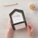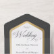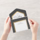 AVAILABLE WITH OR WITHOUT A QR CODE OR DINNER SELECTION OPTIONS. This design features a charcoal black background with a white text area framed in faux gold foil. A monogram with the bride and groom's first initial on the outside flap completes it. Created by Simply Farmhouse Press.