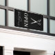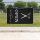 Vertical Open business banner for a hair salon or seamstress with a pair of scissors in white over OPEN written in elegant letters, and welcome in a swirly script against a black background. A clean, minimalist open for business banner for a hair salon, barbershop, or similar. Black small business open banner without logo with a pair of scissors.