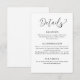 This minimal and elegant wedding details card features sleek black text on a crisp white background, offering a refined and contemporary aesthetic. Designed for clarity and sophistication, it provides essential information in a clean, easy-to-read format. The timeless design complements various wedding themes, from classic to modern, making it a versatile addition to your stationery set. Fully customisable, this card allows you to personalise every detail effortlessly, ensuring a seamless and stylish way to keep your guests informed.