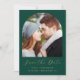 This simple, minimalist Save the Date card features a boho photo arch above the words "Save the Date" in elegant gold-colored handwriting script, followed by the couple's names, wedding date and city in sans serif font on an emerald green background. Add a more detailed message with additional information on the reverse.