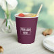 Minimal business logo simple typography soft white and maroon purple red branded coffee paper cups. Customize with your company's logo and add your own personalized text. Text font and color can easily be changed in the design editor to match your branding colors.
