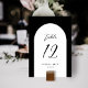 These stylish, simple wedding table number cards feature an arch shape in white over a custom color background (shown in black). Easy to personalize for your wedding or other special occasion.