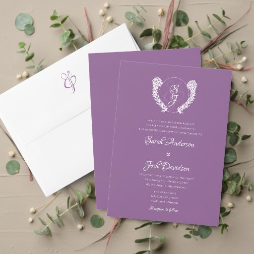 Minimal Elegant Floral Monogram Purple Wedding Invitation