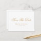 Stylish, romantic gold script typography on top of a white creme color save the date postcard. Send this minimal announcement card as a reminder to your friends and family to mark their calendars this season for a dream wedding. This modern product can be personalized by you to make it unique. You can edit all the event details written on the back of the invite card like the names of the bride and groom and the date of the ceremony. Sophisticated. Elegant stationery essentials. Contact designer for any special requests.