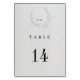 Minimal faux blind deboss cotton wedding table number featuring a printed deboss wreath effect and editable table numbers via Template Objects in the Zazzle editor.