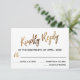 This suite's distinction is due to the modern, handwritten script font used for accent phrases. In this piece, the hand-lettered script font was used to create graphics depicting the words "kindly reply" and "M". These images were embellished with a faux-metallic smooth gold foil effect. Use the template fields to add your personal details and make this unique, modern design your own. The solid background can be changed to any color you prefer. Please reach out with any special requests or for customizing assistance. // 105 //