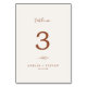 This minimal leaf boho cream wedding table number is perfect for a boho wedding. The design features a simple greenery leaf silhouette in earthy burnt orange on a cream background with minimalist desert bohemian style. The card prints on the front and back (double-sided). Items are printed exactly as they appear on your screen when you add to cart, so personalize and add each table number that you need to your cart individually.