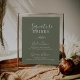 This minimal leaf dark green signature drinks poster sign is perfect for a boho wedding. The design features a simple greenery leaf silhouette in olive green with minimalist mountain bohemian style.