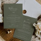These minimal leaf dark green welcome letter & itinerary cards are perfect for a boho wedding. The design features a simple greenery leaf silhouette in olive green with minimalist mountain bohemian style. The front of the card features a welcome letter and the back of the card features the wedding itinerary. These notes are perfect for destination weddings and hotel guest welcome bags.
