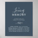 This minimal leaf slate blue in loving memory memorial poster sign is perfect for an elegant wedding. The design features a simple greenery silhouette in a dark gray blue with classic minimalist style.