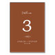 This minimal leaf terracotta wedding table number is perfect for a boho wedding. The design features a simple greenery leaf silhouette in earthy burnt orange with minimalist desert bohemian style. The card prints on the front and back (double-sided). Items are printed exactly as they appear on your screen when you add to cart, so personalize and add each table number that you need to your cart individually.
